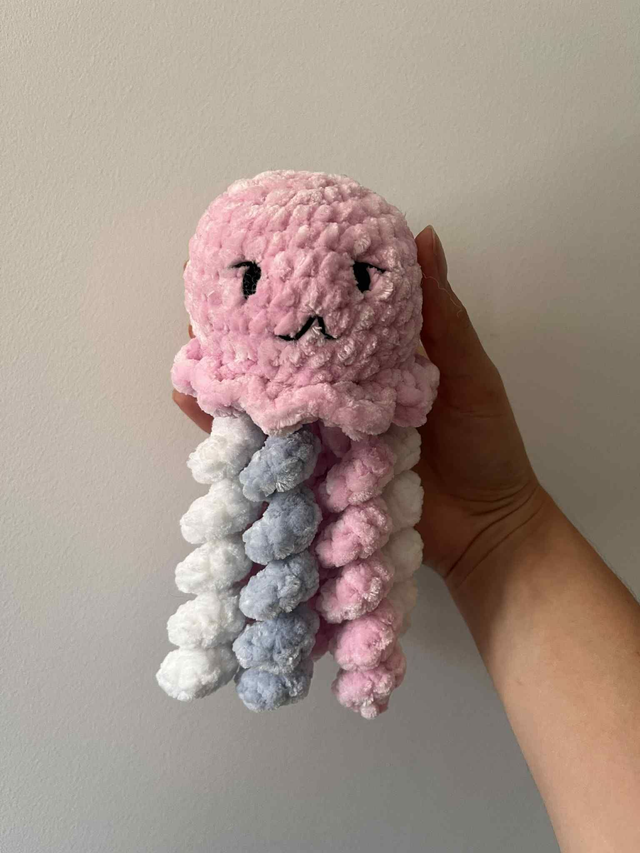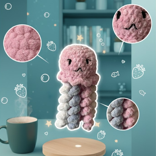 Plongez dans un monde tout doux avec cette peluche méduse au crochet aux couleurs pastel, crochetée à la main avec soin. Ses longs tentacules souples et son dôme moelleux en font un compagnon original et apaisant, à suspendre ou à câliner.